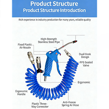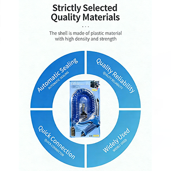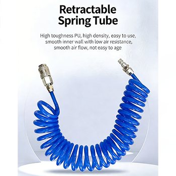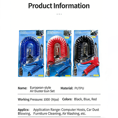 telescopic spring trachea in the suit is made of PU material, and there are three colors to choose from: black, blue and red. The inner wall of the highly tough PU material is smooth, which makes the wind resistance lower and the airflow will be smoother. At the same time, PU material has excellent wear resistance and aging resistance, and the working pressure can reach 1000 Mpa, which can provide strong airflow in dust removal work, making dust removal work more efficient. The quick connectors at both ends of the trachea are also very practical. The plug-in design does not require tools, and the connection with the air gun and air source can be completed in a few seconds, which greatly improves the operation efficiency.