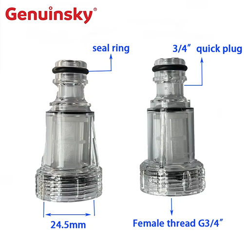 Genuinsky's Inlet water filter, one end of the product is 3/4" quick plug with seal ring. The other end is Female thread G3/4", with a diameter of 24.5mm.NINGBO GENUINSKY Company is a company specializing in the production of car cleaning accessories. The company integrates manufacturing, development and sales. It has intimate after-sales service, excellent quality and preferential price. Over the years, it has achieved pleasant transactions with many companies. You can rest assured to buy.