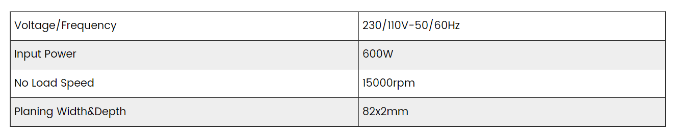 Why 82x2mm Electric Planer is an efficient woodworking tool can be introduced from several aspects. Judging from the core parameters of the product, first, the wide voltage of 230/110V-50/60Hz can not only be adapted to the 220V civil power supply system in China, but also the overseas 110V working environment, and the frequency difference of 50/60Hz between different regions, so no matter Whether it is the domestic work demand or the use of imported equipment, good connection can be achieved, reducing the mismatch between voltage and frequency. Second, the rated input power of 600W can make the equipment continuously stable output, and there is also sufficient power reserve for stable planing in the face of relatively hard and thick materials, which can avoid instability in work due to excessive load, so that the efficiency and quality of work can be online at the same time. Third, the no-load speed of 15,000 rpmin can make the planer have a high cutting line speed, which can quickly plan a smooth cut when processing wood. At the same time, the speed of processing materials can be very fast, so it is very important when processing a lot of work, which greatly improves work efficiency. Fourth, the planing width of 82mm can reduce the number of round trips when processing relatively wide wood surfaces, which saves time. The planing depth of 2mm can realize the two-way needs of roughing and finishing, which can not only carry out fine trimming, but also remove excess wood during processing. It can be seen that this 82x2mm Electric Planer has a variety of core advantages, so it has important responsibilities in the field of woodworking.