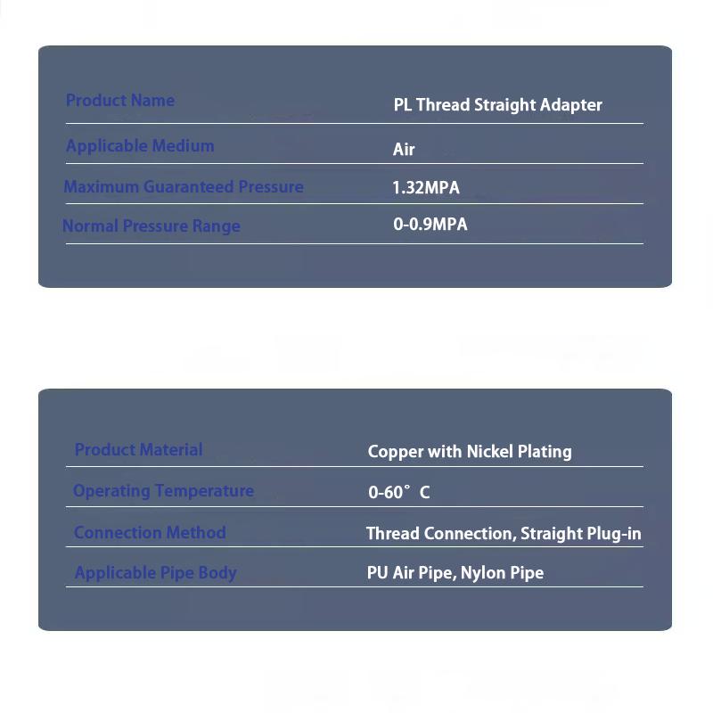 The PL Thread Straight Adapter and the tube can even rotate 360° freely after installation, which means that it can break the limitation of the traditional joint angle fixation. It can adapt to the complex pipeline trend, and the applicable scenarios of the product are more extensive. At the same time, the product has the tolerance to adapt to different scenarios. For example, it can also maintain stable performance in the high-temperature production line, because the tolerance range of the product itself is in the temperature range of 0-60°C. In addition, the maximum guaranteed pressure can reach 1.32MPa, and the normal working pressure range is 0-0.9MPa, which can fully cover the stable operation of equipment that requires high-pressure working conditions such as pneumatic tools and automated cylinders.