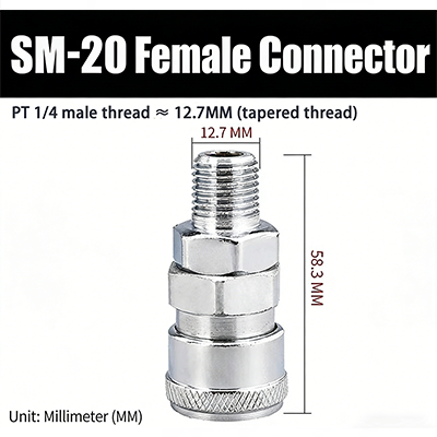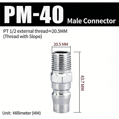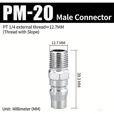 1. PM-20. PT 1/4 male thread ,The diameter of the threaded part is 12.7 mm, and the total length of the product is 39.3 mm.