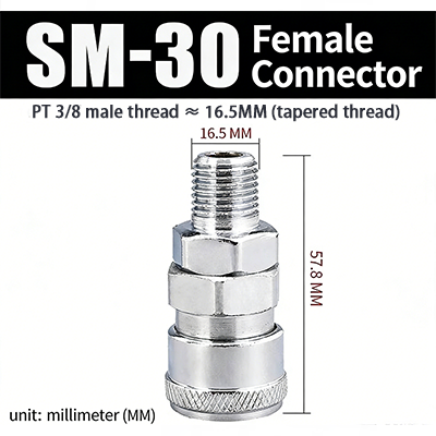 2. SM-30.PT 3/8 male thread is a conical external thread structure with a thread diameter of 16.5 mm and an overall length of 57.8 mm.