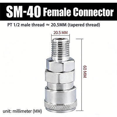 3. SM-40. PT 1/2 male thread is a conical thread with a thread diameter of 20.5 mm and an overall length of 60 mm.