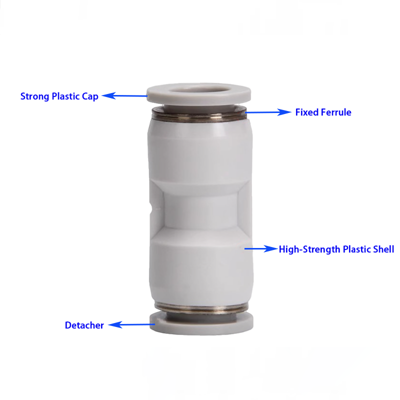 The following is an introduction from several important features of PU Straight Quick-Connect Fitting. The first feature is the composition of the product itself. The joint itself is composed of a four-fold structure. The first heavy structure is the strong plastic cap. The high-toughness engineering plastic injection molding makes the product itself both high-pressure and wear-resistant, which provides a certain protective effect for the top of the product. The second important structure is the fixed card sleeve. The fixed card sleeve made of stainless steel has excellent corrosion resistance, and it is also very firm to lock the trachea to prevent it from falling off during use. The third heavy structure is a high-strength plastic shell. The main body of the product itself is made of reinforced engineering plastic, which has outstanding pressure resistance and good insulation. The fourth important structure is the releaser. The design of the releaser allows the operator to easily realize the disassembly of the trachea by pressing. At the same time, the design is ergonomic and makes the operation more convenient. The second feature is the five structural forms of the product. They are straight-through type, T-type three-way type, cross-type four-way type, Y-type three-way type and multi-way type. These structural forms are from single connections to complex stunts, basically covering the layout needs of pneumatic pipelines in different scenarios in an all-round way, which makes the system design flexible and efficient. The third feature is multi-specification adaptation. The connector supports six types of trachea outer diameters: 4mm, 6mm, 8mm, 10mm, 12mm and 16mm, which can match common PU trachea and nylon tubes, and accurately match trachea and equipment. From micro-pneumatic components to large-scale equipment, the needs of gas pipe diameters can be met.