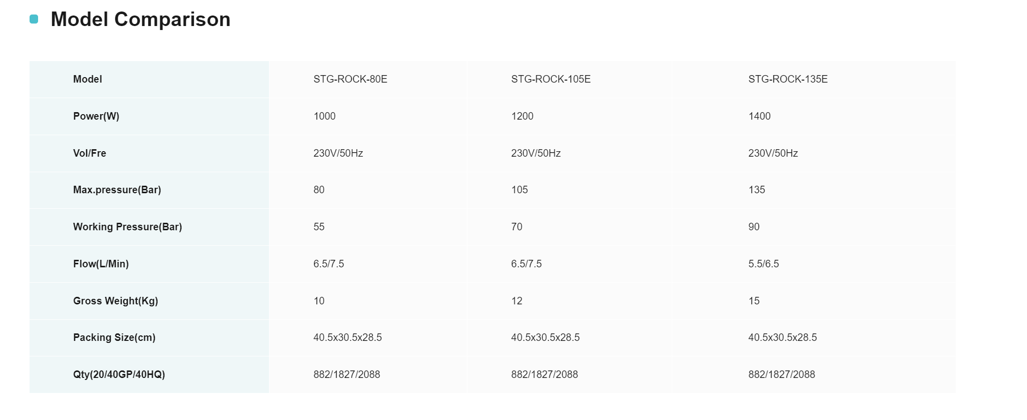 STG-ROCK-E Portable High-Pressure Washer is divided into three models, namely STG-ROCK-80E, STG-ROCK-105E and STG-ROCK-135E. The power supply specifications of the three models are all 230V/50Hz, and the packaging size is also uniformly 40.5×30.5×28.5 cm. The number of boxes for high cabinets is also the same. The number of boxes for 20-foot-high cabinets is 882 units, the number of boxes for 40GP high cabinets is 1827 units, and the number of boxes for 40HQ high cabinets The number of boxes is 2,088 units.