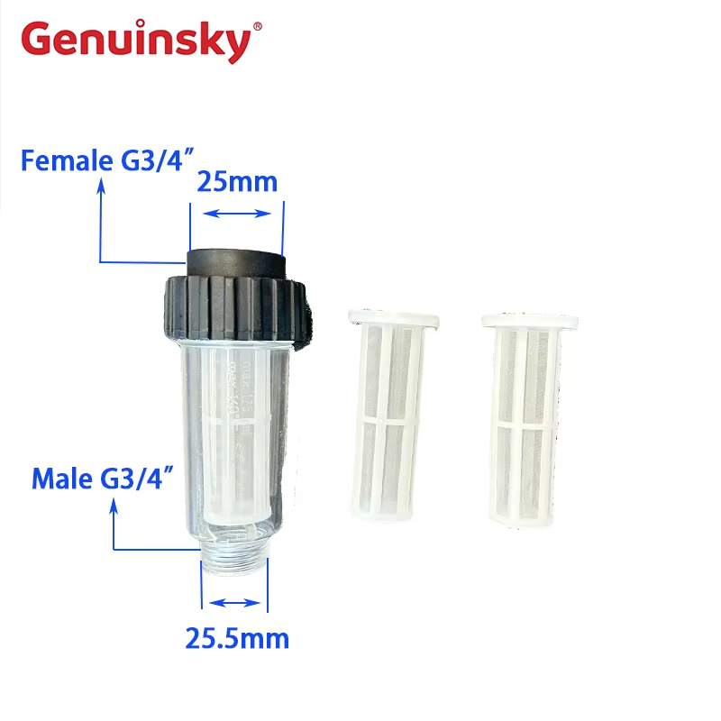 This water filter for karcher has two filter mesh. One end is Female G3/4", and the diameter is 25mm. The other end is Male G3/4", with a diameter of 25.5mm. NINGBO GENUINSKY Company is a company specializing in the production of car cleaning accessories. The company integrates manufacturing, development and sales. It has intimate after-sales service, excellent quality and preferential price. Over the years, it has achieved pleasant transactions with many companies. You can rest assured to buy.
